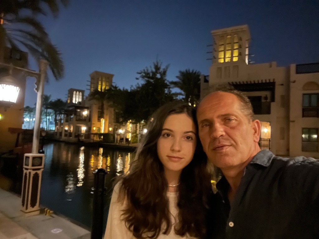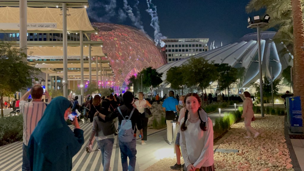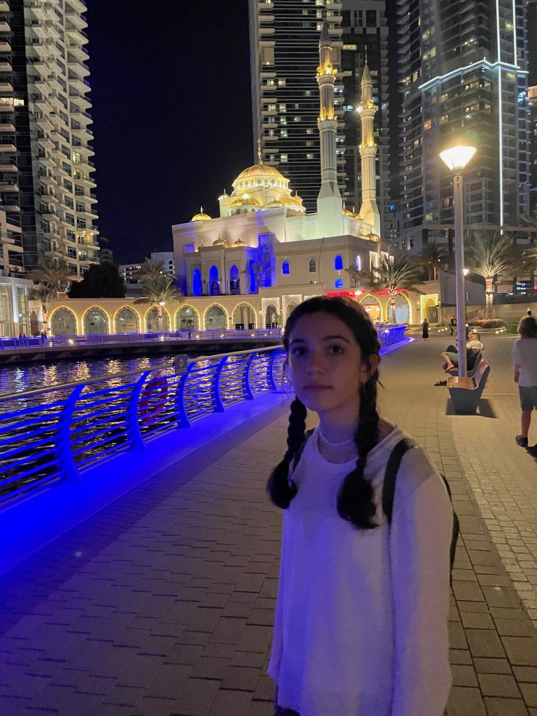 Today is probably our busiest day of all. We started off by waking up early to take a taxi to the World Expo 2020 which only happens every 4 years. After a 30 minute drive we begun by visiting Korea’s pavilion which was on the top of my list. It involved a lot of virtual reality as well as technology. We then headed to Saudi Arabia which led us to pass through a giant dome. Once we got to the pavilion it started off with a ring of water coming down from the ceiling in which I got completely soaked in. It also included a room full of stars and a giant moon which definitely made it my favorite pavilion of the day. After we headed back to Korea’s pavilion where we had the best lunch I’ve had in a while, I was definitely craving some Korean food for a while. We visited some other countries such as Rwanda, Maldives, and India before heading back with the metro. Our next stop and probably the most historical was the Burj Khalifa. We got ourselves some VIP tickets to the 148 floor and at 5 began to make our ascent to the top. We stayed for the entire sunset taking several pictures of both the view and ourselves before heading down for some good Lebanese food with our friends. After we got bored of just sitting around at the table we went inside of one of the world’s largest malls (Dubai Mall) to look at the indoor aquarium. By the time we got home it was already 12:00 and was time to go to sleep.